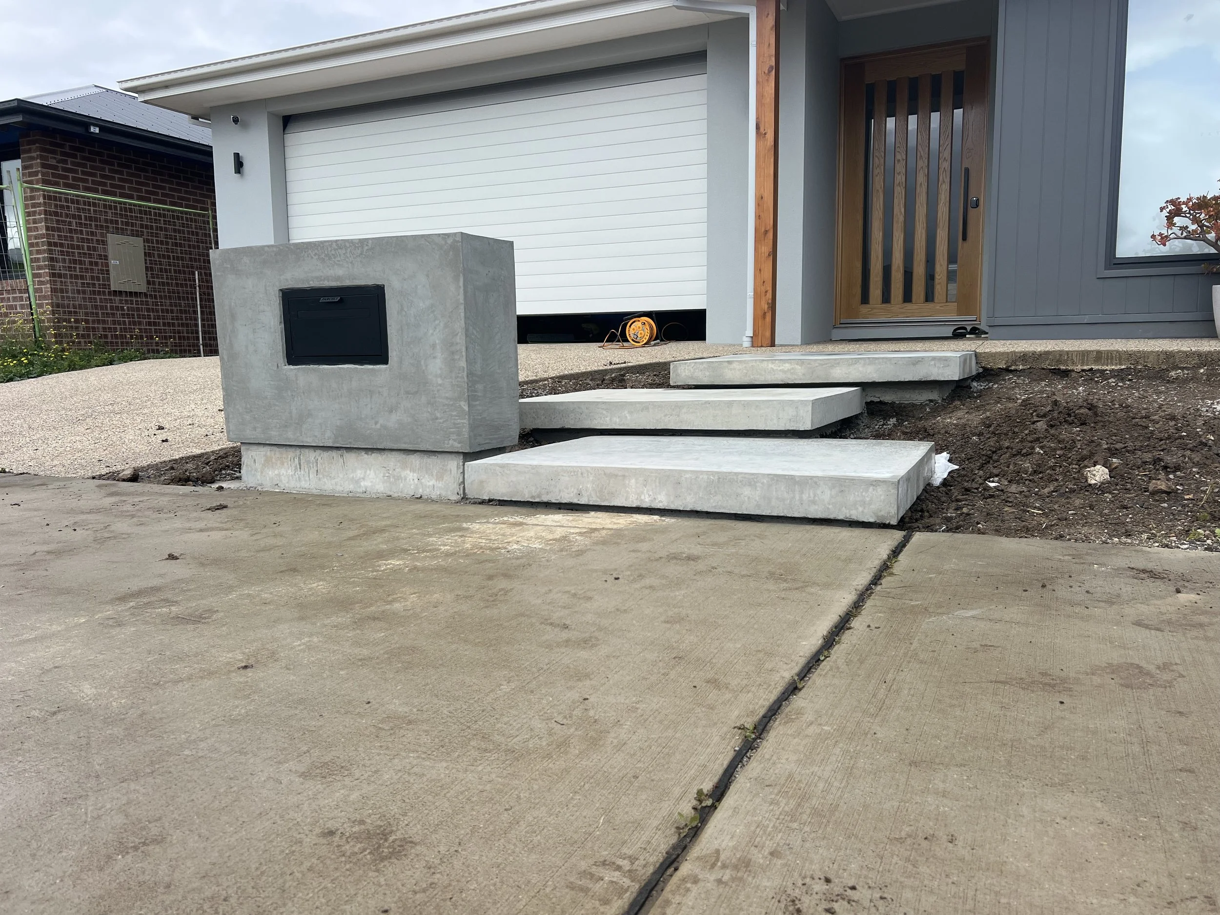 The finished result enhances the overall entrance of the property, providing a bold yet refined statement that complements the home’s contemporary design. Floating concrete stairs are not only functional but also add significant aesthetic value, creating a strong first impression from the street.